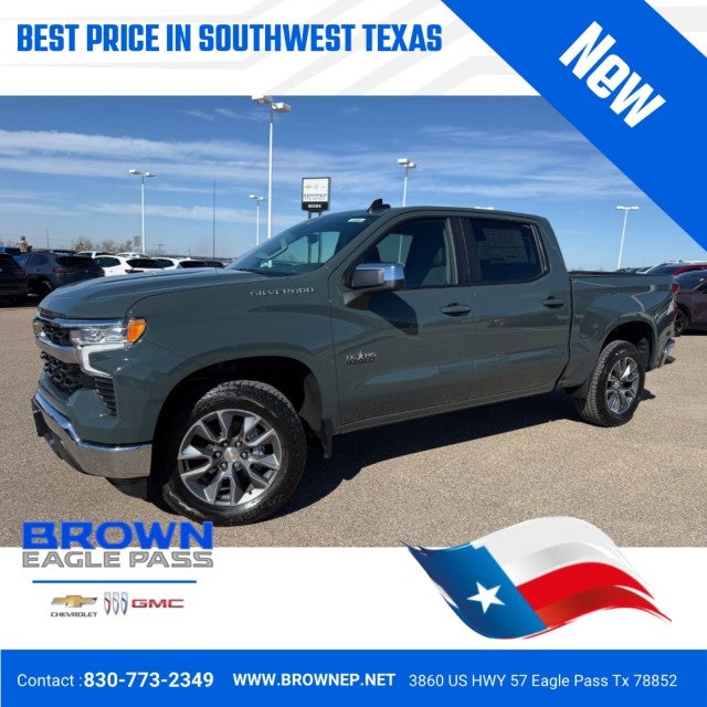 You can find this 2026 Chevrolet Silverado 1500 LT and many others like it at Brown Chevrolet Buick GMC of Eagle Pass. This Chevrolet includes: Optional Equipment: Convenience Full floor console Covered floor console storage Garage door opener Front wireless smart device charging Power rear windshield GCW Alert weight capacity alert Original Warranty 60 month/60,000 miles Comfort Seating capacity - 5 Bucket front seats Metal-look console insert Transmission 10-Speed Automatic Transmission 10-speed automatic Overdrive transmission Lock-up transmission Transmission electronic control Automatic Electronic Transmission Range Selector Shifter Exterior and Appearance Non-metallic paint Wheel security locks 20 x 9-inch front and rear machined w/painted accents aluminum wheels P275/60SR20 AT BSW front and rear tires Trailer light test Trailer light malfunction warning Trailer theft alarm Seating Front Bucket Seats Seating capacity - 5 Bucket front seats Front beverage holders Metal-look console insert Full floor console Covered floor console storage Front wireless smart device charging 6 USB ports Mechanical 6,900 lbs (3,130 Kg) GVWR Powertrain and Mechanical Engine oil cooler 10-speed automatic Transmission oil cooler EcoTec3 5.3L V-8 gasoline direct injection, variable valve control, regular unleaded, engine with cylinder deactivation and 355HP EcoTec3 5.3L V-8 EcoTec3 V8 Tires & Wheels 275/60R20SL AT BW Tires Full-size spare tire with steel wheel P275/60SR20 AT BSW front and rear tires 20 X 9 Painted Aluminum Wheels 20 x 9-inch front and rear machined w/painted accents aluminum wheels Wheel Locks (set of 4) Wheel security locks 255/80R17SL AS BW Spare Tire Full-size spare tire with steel wheel Exterior Texas Edition Badging Power Sliding Rear Window with Rear Defogger Rear window defroster Power rear windshield Additional Options Convenience Package II Garage door opener Rear Trailer Guidance Lines vehicle and trailer reverse assist with visual graphic guidance only Rear window defroster Power rear windshield HD Rear Vision Camera w/Hitch View rear mounted camera Trailer light test Trailer light malfunction warning Trailer theft alarm GCW Alert weight capacity alert Hitch Guidance vehicle to trailer hitching assist Texas Edition Plus Preferred Equipment Group 1LT Bluetooth® handsfree wireless device connectivity AM/FM/SiriusXM with 360Lsatellite Remote Start Package Keyfob remote start Rear window defroster Smart device remote start Interior Floor Mounted Center Console Front beverage holders Metal-look console insert Full floor console Covered floor console storage Wireless Charging Front wireless smart device charging In-Vehicle Trailering System App Rear Trailer Guidance Lines vehicle and trailer reverse assist with visual graphic guidance only Trailer light test Trailer light malfunction warning Trailer theft alarm GCW Alert weight capacity alert Universal Home Remote Garage door opener Jet Black Engine 5.3L EcoTec3 V8 Engine Front mounted engine Regular unleaded Spark ignition system Longitudinal mounted engine Aluminum engine block Aluminum cylinder head Engine oil cooler Transmission oil cooler 60 month/60,000 miles EcoTec3 5.3L V-8 gasoline direct injection, variable valve control, regular unleaded, engine with cylinder deactivation and 355HP EcoTec3 5.3L V-8 EcoTec3 V8 External Engine Oil Cooler Engine oil cooler Auxiliary External Transmission Oil Cooler Transmission oil cooler 170 Amp Alternator Entertainment 2 USB Data Ports 6 USB ports Paint Cypress Gray Non-metallic paint Trailering Hitch Guidance with Hitch View Rear Trailer Guidance Lines vehicle and trailer reverse assist with visual graphic guidance only HD Rear Vision Camera w/Hitch View rear mounted camera Hitch Guidance vehicle to trailer hitching assist Suspension 3.23 Rear Axle Ratio High Capacity Suspension Package Standard ride suspension *Note - For third party subscriptions or services, please contact the dealer for more information.* Pull up in the vehicl