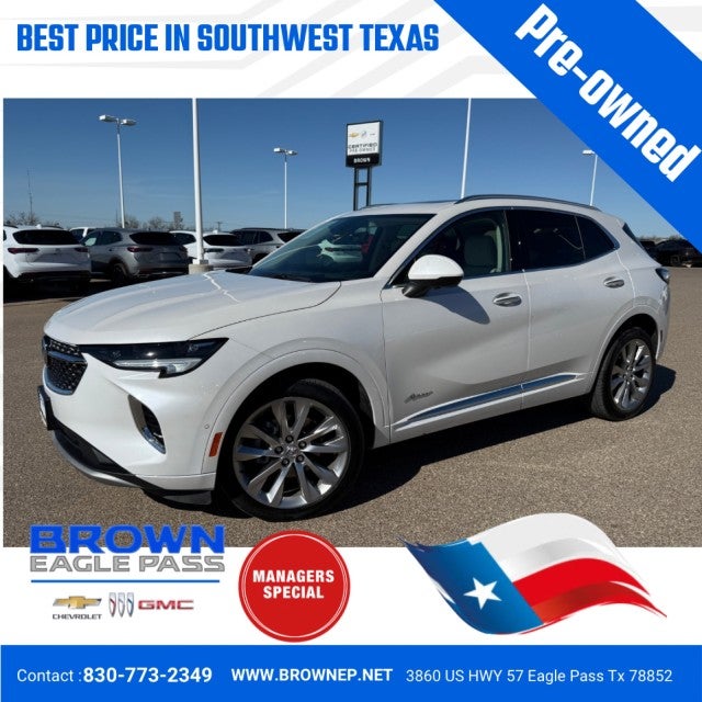 Brown Chevrolet Buick GMC of Eagle Pass has a wide selection of exceptional pre-owned vehicles to choose from, including this 2023 Buick Envision. Treat yourself to an SUV that surrounds you with all the comfort and conveniences of a luxury sedan. There's a level of quality and refinement in this Buick Envision AWD 4dr Avenir that you won't find in your average vehicle. Enhanced performance, a refined interior and exceptional fuel economy are just a few of the things you'll enjoy about this all-wheel drive vehicle. Low, low mileage coupled with an exacting maintenance program make this vehicle a rare find.